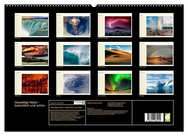 Für diesen Kalender hat der Fotokünstler Peter Roder zwölf beeindruckende Aufnahmen aus der Natur zusammengestellt und gestaltet, eine Freude für jeden Freund imposanter Naturbilder, ein Begleiter für das ganze Jahr oder ein wertvolles Geschenk für die, die wir lieben.