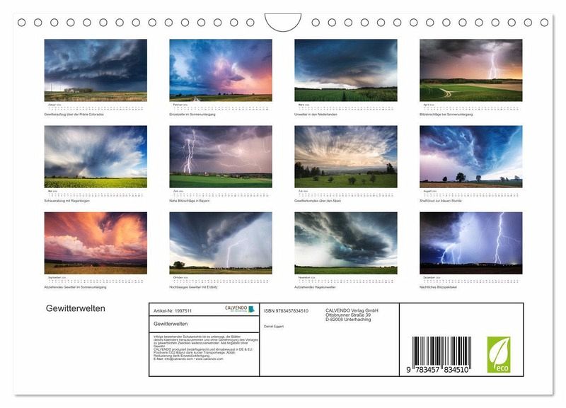 QUALITÄT - Hochwertiger Fotokalender mit 12 wunderschönen Motiven auf lichtbeständigem Bilderdruckpapier, robuste Spiralbindung mit Aufhängebügel.NACHHALTIG - deutliche Abfallreduzierung durch bedarfsgerechte Einzelstückfertigung, umweltfreundliches FSC-zertifiziertes Papier, Produktion in Deutschland, klimabewusste Logistik.PERFEKTES GESCHENK - Kalender für Freunde und Familie, für Kinder und Erwachsene, jung und alt, zu Weihnachten, Geburtstag oder zwischendurch.VIELFALT - Bildkalender in verschiedenen Formaten, z.B. DIN A5, DIN A4, DIN A3 sowie DIN A2. Ob Naturmotiv, Gemälde oder Fotos, ideal für ein persönliches Wohlfühlambiente.Dunkle Gewitterwolken in beeindruckenden Formationen, zackige Blitze - Schönheit und Gefahr liegen hier dicht nebeneinander. Lassen Sie sich faszinieren von imposanten Gewitterfotografien. von Autor(in): Daniel Eggert