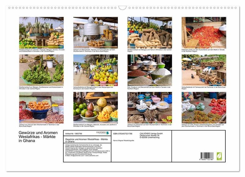 QUALITÄT - Hochwertiger Fotokalender mit 12 wunderschönen Motiven auf lichtbeständigem Bilderdruckpapier, robuste Spiralbindung mit Aufhängebügel.NACHHALTIG - deutliche Abfallreduzierung durch bedarfsgerechte Einzelstückfertigung, umweltfreundliches FSC-zertifiziertes Papier, Produktion in Deutschland, klimabewusste Logistik.PERFEKTES GESCHENK - Kalender für Freunde und Familie, für Kinder und Erwachsene, jung und alt, zu Weihnachten, Geburtstag oder zwischendurch.VIELFALT - Bildkalender in verschiedenen Formaten, z.B. DIN A5, DIN A4, DIN A3 sowie DIN A2. Ob Naturmotiv, Gemälde oder Fotos, ideal für ein persönliches Wohlfühlambiente.Eine kulinarische Reise zu den Märkten Ghanas in sinnlich schönen Bildern von Autor(in): Hanna Wagner