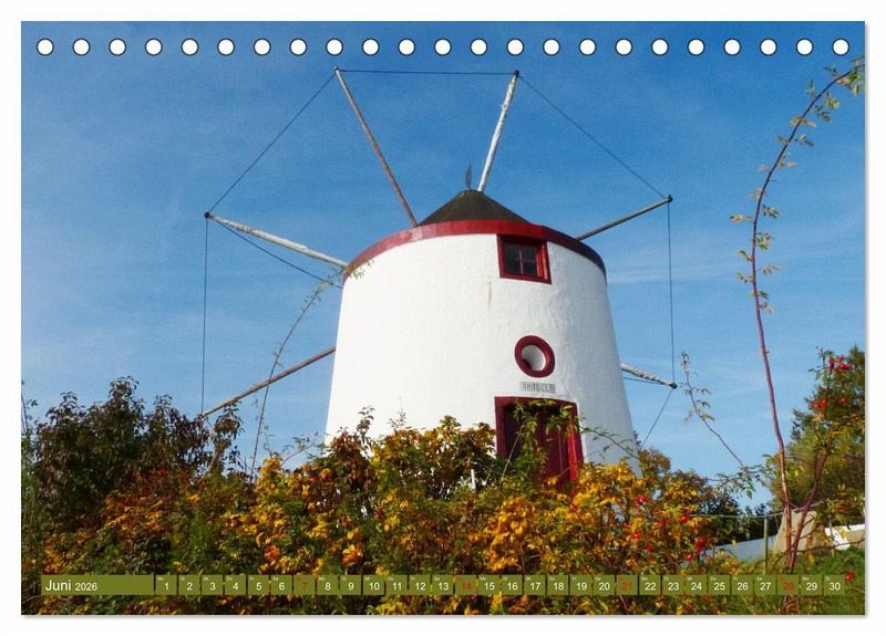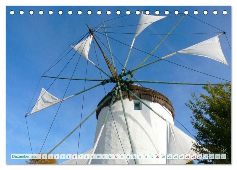 April: Windmühlen aus der Algarve, Portugal und von Mykonos, Griechenland