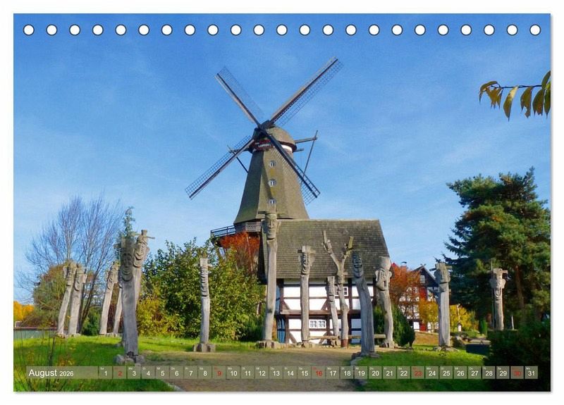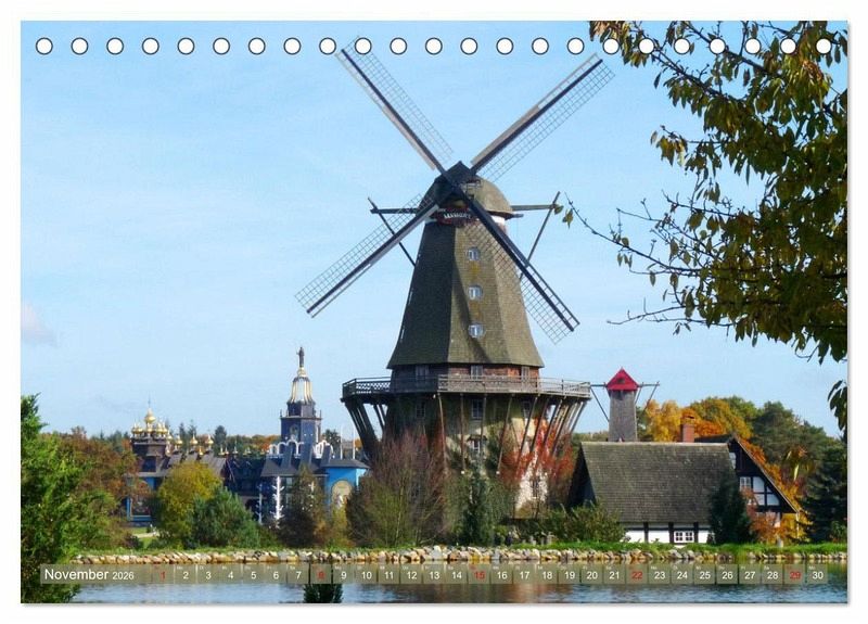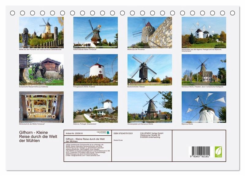 14 Mühlen aus elf Ländern können in der Region Südheide Gifhorn auf 10 Hektar Land bewundert werden. Die Nachbauten der Mühlen stammen aus Frankreich, Spanien, Griechenland und Portugal und vermitteln das Flair des Südens. Rossmühle und Bockwindmühlen aus Deutschland und Russland, sowie die historische Mühle von Sanssouci sind sehenswerte Highlights der Anlage. Asien ist mit einer Wassermühle aus Südkorea vertreten und überrascht mit skurrilen, exotischen Holzfiguren. Ein sehenswerter Kalender, der die Reiselust befeuert.