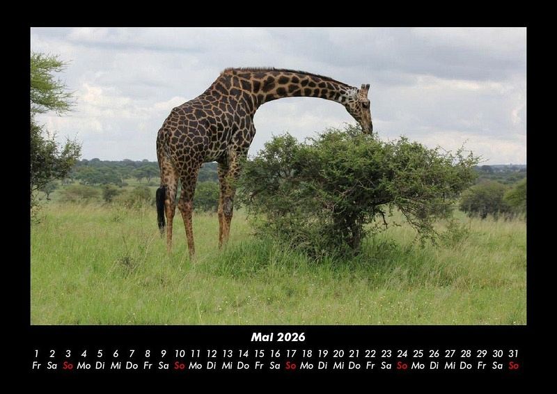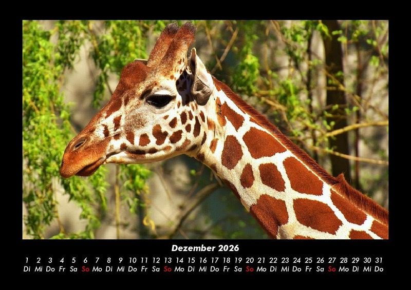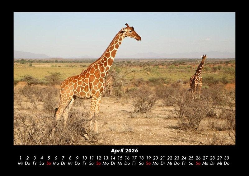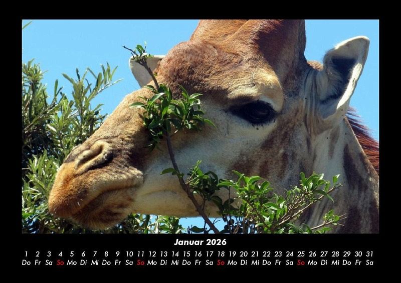 Giraffen 2026 Motivkalender DIN A3 Die Giraffen sind die höchsten landlebenden Tiere der Welt. Dieser Kalender zeigt mit 12 beeindruckenden Bildern die Eleganz dieser Lebewesen. Vero-Kalender erhalten Sie mit Motiven aus den verschiedensten Themenbereichen wie Natur, Blumen und Landschaft, Tierwelt, Architektur, Reise und Urlaub, Technik, Automobil und Eisenbahn, Emotionen, Sport und Musik. Gedruckt werden die Monats-Kalender aus dem Vero Verlag auf hochwertigem Kalenderbogen in Premium-Qualität und verschiedenen Größen. Die Vielfältigkeit der Motive unserer Foto-Kalender ist dank der Zusammenarbeit mit kreativen Fotografen möglich.…mehr