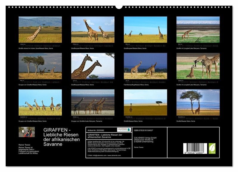 PREMIUM-LINIE - Brillanter Fotokalender mit 12 wunderschönen Motiven, Kunstdruck in Hochglanz in Museumsqualität.QUALITÄT - edle Materialien, stabile Rückwand mit 2 innovativen Einstecktaschen für eine optimale Präsentation an der Wand.NACHHALTIG - deutliche Abfallreduzierung durch bedarfsgerechte Einzelstückfertigung, umweltfreundliches FSC-zertifiziertes Papier, Produktion in Deutschland, klimabewusste Logistik.PERFEKTES GESCHENK - Kalender für Freunde und Familie, für Kinder und Erwachsene, jung und alt, zu Weihnachten, Geburtstag oder zwischendurch.Giraffen - die Riesen der Savanne auf dem afrikanischen Kontinent in stimmungsvollen Bildern von Rainer Tewes festgehalten von Autor(in): Rainer Tewes