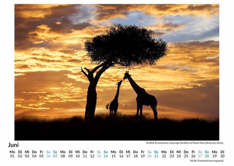 Entdecken Sie die faszinierende Welt der Giraffen mit unserem hochwertigen Wandkalender! Lassen Sie sich Monat für Monat von 12 atemberaubenden Motiven dieser majestätischen Tiere verzaubern. Gedruckt auf lichtbeständigem, FSC-zertifiziertem Bilderdruckpapier, bringt dieser Kalender nicht nur Schönheit in Ihr Zuhause, sondern unterstützt auch nachhaltige Forstwirtschaft. Die brillanten Farben und detailreichen Aufnahmen machen ihn zu einem echten Hingucker in jedem Raum. Perfekt als Geschenk oder für den eigenen Gebrauch - holen Sie sich ein Stück afrikanische Wildnis direkt an Ihre Wand! Jetzt bestellen und das ganze Jahr über die Eleganz der Giraffen genießen! Hochwertig Erleben Sie ein Jahr voller Eleganz mit unserem Premium-Fotokalender. Jedes der 12 Motive ist auf hochwertigem, lichtbeständigem Bilderdruckpapier gedruckt, um die Lebendigkeit jedes Bildes zu bewahren. Die robuste Spiralbindung gewährleistet Langlebigkeit und einfache Handhabung. Nachhaltig Unser Engagement für die Umwelt spiegelt sich in jedem Exemplar wider. Durch die Produktion auf Abruf reduzieren wir signifikant unseren Abfall. Wir verwenden ausschließlich umweltfreundliches, FSC-zertifiziertes Papier. Stolz gefertigt in Deutschland, achten wir bei unserer Logistik auf Klimaschutz, um unseren ökologischen Fußabdruck zu minimieren. Das ideale Geschenk Dieser Kalender ist das perfekte Präsent für jeden Anlass - ob Weihnachten, Geburtstage oder einfach als liebevolle Aufmerksamkeit zwischendurch. Geeignet für Freunde, Familie, Kinder und Erwachsene gleichermaßen, bereichert er jedes Zuhause mit seiner Vielfalt und Schönheit, unabhängig vom Alter der Beschenkten.