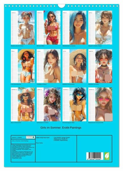 Dieser Kalender fängt die Schönheit und Ausstrahlung selbstbewusster Frauen in sommerlichen Szenerien ein. Jedes Painting zeigt freizügige Girls in der Sonne, am Wasser und umgeben von purer Leichtigkeit. Mit sinnlicher Eleganz verkörpern sie die Wärme und Leidenschaft der warmen Jahreszeit. Alle Bilder wurden mit Hilfe von KI erstellt und sind eine Hommage an verführerische Weiblichkeit und künstlerische Ästhetik.