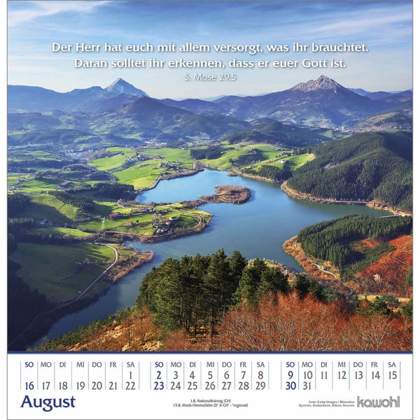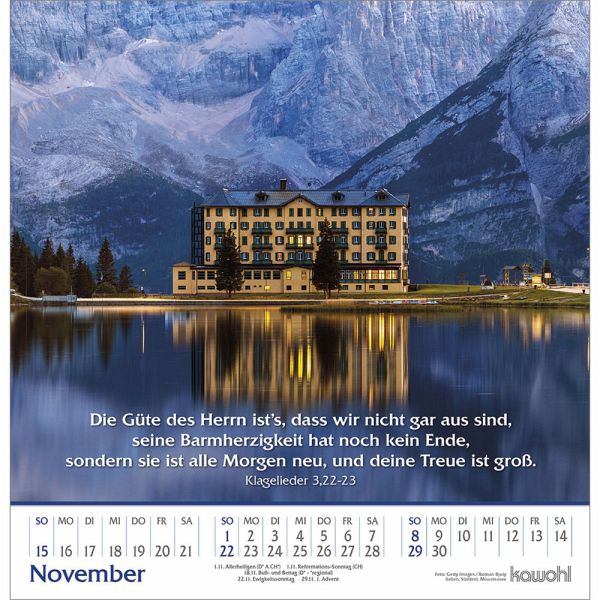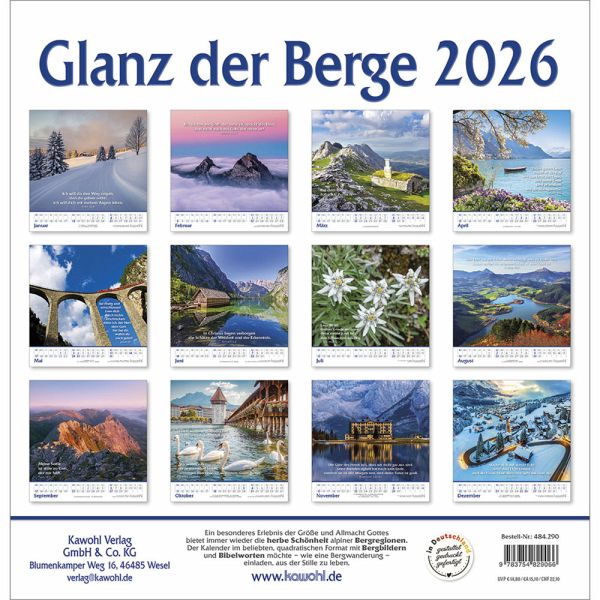 Berge und Täler - grandiose LandschaftenWandkalender mit Bergbildern und grandiosen LandschaftenEin besonderes Erlebnis der Größe und Allmacht Gottes bietet immer wieder die herbe Schönheit alpiner Bergregionen.Der Kalender im beliebten, quadratischen Format mit Bergbildern möchte - wie eine Bergwanderung - einladen, aus der Stille zu leben.Wand-Kalender:- mit Bibelworten- mit Bergbildern- Kunstdruck-Papier