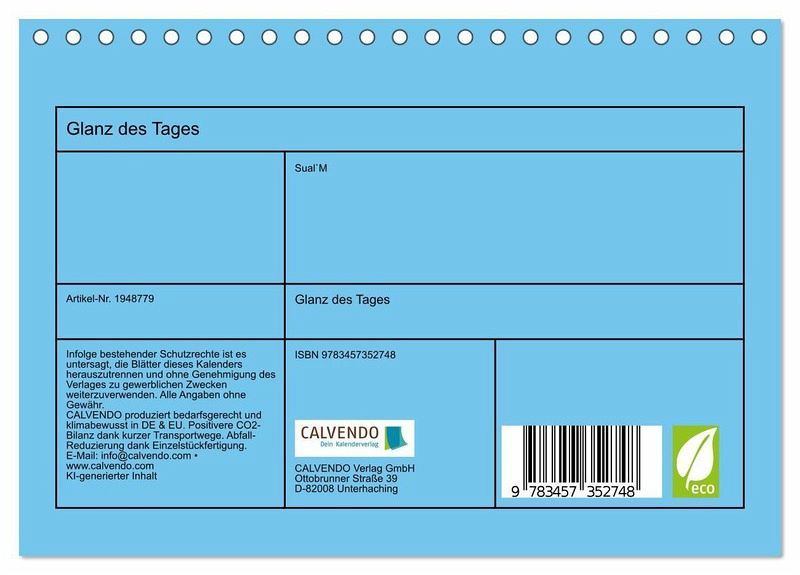 QUALITÄT - Hochwertiger Fotokalender mit 12 wunderschönen Motiven auf lichtbeständigem Bilderdruckpapier, robuste Spiralbindung.NACHHALTIG - deutliche Abfallreduzierung durch bedarfsgerechte Einzelstückfertigung, umweltfreundliches FSC-zertifiziertes Papier, Produktion in Deutschland, klimabewusste Logistik.PERFEKTES GESCHENK - Kalender für Freunde und Familie, für Kinder und Erwachsene, jung und alt, zu Weihnachten, Geburtstag oder zwischendurch.VIELFALT - Bildkalender in verschiedenen Formaten,z.B. DIN A5, DIN A4, DIN A3 sowie DIN A2. Ob Naturmotiv, Gemälde oder Fotos, ideal für ein persönliches Wohlfühlambiente."Glanz des Tages" präsentiert die faszinierende Ausstrahlung der Tageszeit. Durch sanfte Morgenstrahlen, intensives Tageslicht und die goldene Abendstimmung werden Momente voller Eleganz und Energie eingefangen. von Autor(in): Ewell Maria