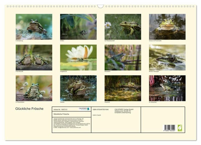 QUALITÄT - Hochwertiger Fotokalender mit 12 wunderschönen Motiven auf lichtbeständigem Bilderdruckpapier, robuste Spiralbindung mit Aufhängebügel.NACHHALTIG - deutliche Abfallreduzierung durch bedarfsgerechte Einzelstückfertigung, umweltfreundliches FSC-zertifiziertes Papier, Produktion in Deutschland, klimabewusste Logistik.PERFEKTES GESCHENK - Kalender für Freunde und Familie, für Kinder und Erwachsene, jung und alt, zu Weihnachten, Geburtstag oder zwischendurch.VIELFALT - Bildkalender in verschiedenen Formaten, z.B. DIN A5, DIN A4, DIN A3 sowie DIN A2. Ob Naturmotiv, Gemälde oder Fotos, ideal für ein persönliches Wohlfühlambiente.Heimische Frösche mit der Kamera eingefangen von Autor(in): Kathrin Gawlik