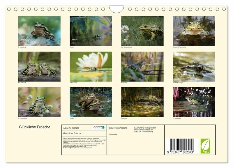 QUALITÄT - Hochwertiger Fotokalender mit 12 wunderschönen Motiven auf lichtbeständigem Bilderdruckpapier, robuste Spiralbindung mit Aufhängebügel.NACHHALTIG - deutliche Abfallreduzierung durch bedarfsgerechte Einzelstückfertigung, umweltfreundliches FSC-zertifiziertes Papier, Produktion in Deutschland, klimabewusste Logistik.PERFEKTES GESCHENK - Kalender für Freunde und Familie, für Kinder und Erwachsene, jung und alt, zu Weihnachten, Geburtstag oder zwischendurch.VIELFALT - Bildkalender in verschiedenen Formaten, z.B. DIN A5, DIN A4, DIN A3 sowie DIN A2. Ob Naturmotiv, Gemälde oder Fotos, ideal für ein persönliches Wohlfühlambiente.Heimische Frösche mit der Kamera eingefangen von Autor(in): Kathrin Gawlik