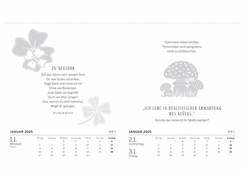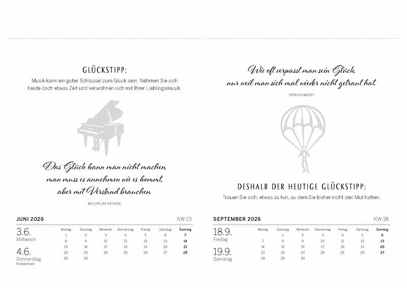 Sinnsprüche, Weisheiten, kleine Erzählungen, Witze und handfeste Tipps: Dieser Kalender ist genau der richtige für alle Glückssucher! Denn Lebensfreude im Alltag ist der Schlüssel für ein beschwingtes und positives Lebensgefühl.