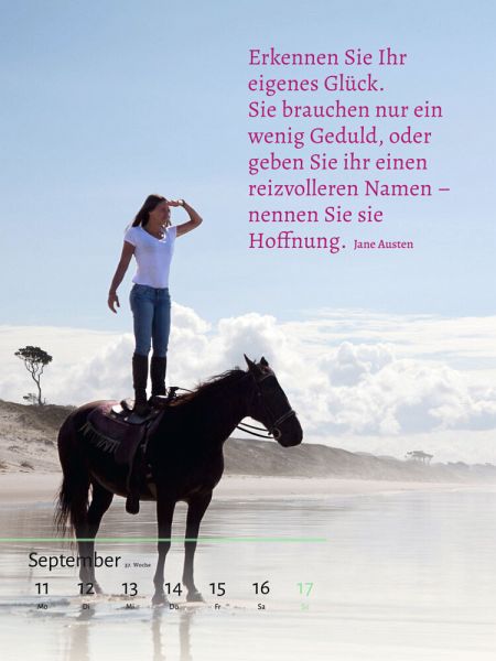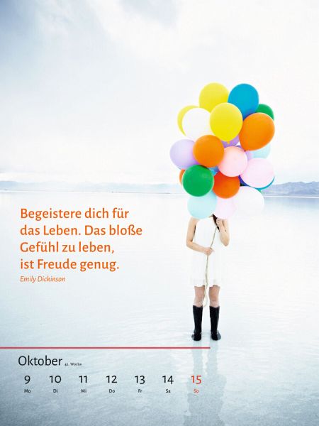 Der große Glückskalender 2023!Unter dem Motto Unbeschreiblich weiblich führt dieser farbenfrohe Kalender mit 53 witzigen Zitaten, Aphorismen und Lebensweisheiten von Frauen für Frauen beschwingt durchs Jahr. Er bietet Woche für Woche Momente voller Glück und Inspiration, Gedanken zum Durchatmen und Entspannen - kurzum Lebensfreude in wilden Zeiten. Das ideale Geschenk für Frauen in jeder Lebenslage - Glücksmomente und Inspiration fürs ganze Jahr!"Es gibt nur eins, solange du lebst: leben!" Martha Gellhorn»Frauen von heute warten nicht auf das Wunderbare, sie inszenieren ihre Wunder selbst.« Katharine Hepburn