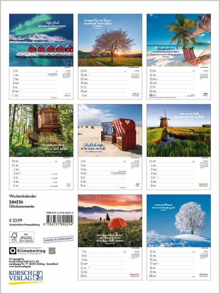 Glücksmomente mit traumhaften Fotos und Zitaten kann man mit diesem Wochenkalender auf 53 Blatt das ganze Jahr genießen. Das übersichtliche Kalendarium bietet zudem Platz für Eintragungen und Termine. Mit Klimabeitrag hergestellt auf nachhaltig produziertem Papier.