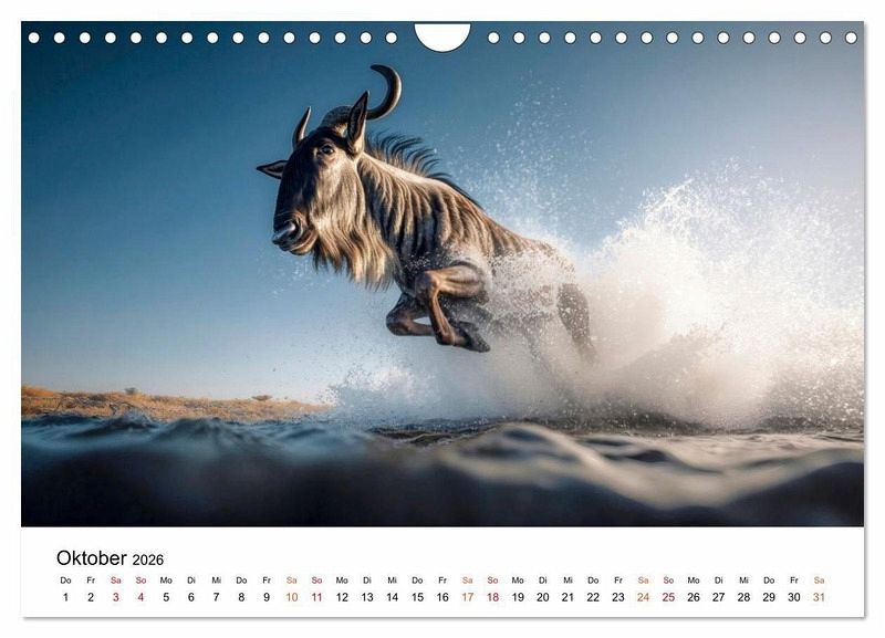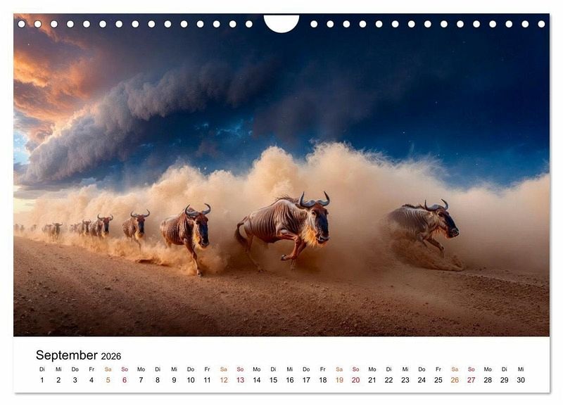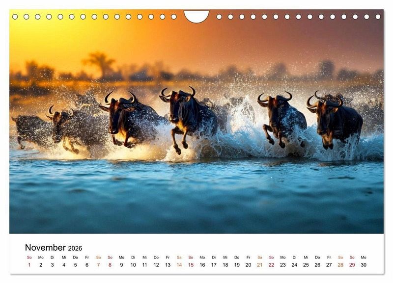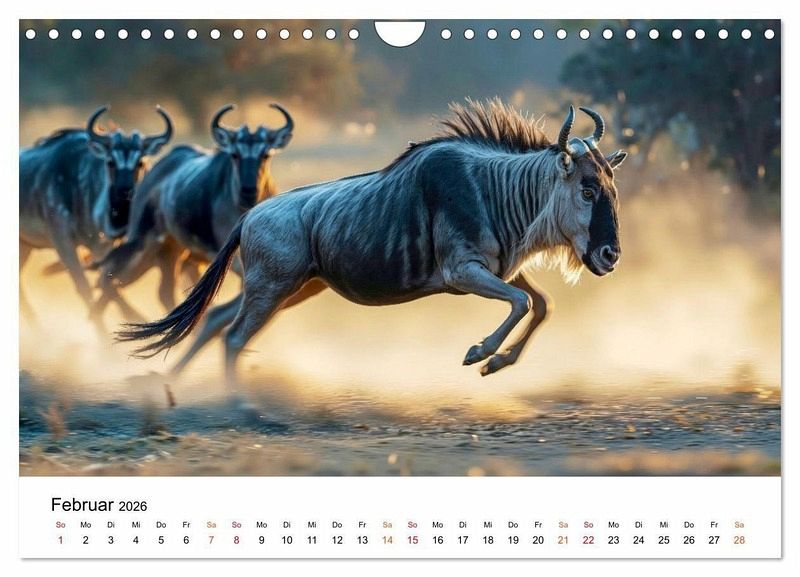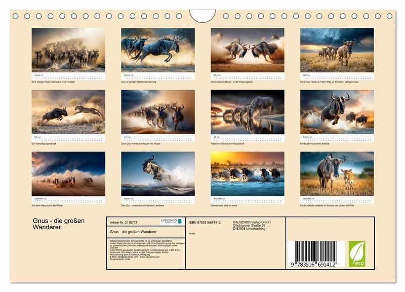 Ein Jahr voller Bewegung, Kraft und Naturgewalt: Dieser Kalender zeigt die eindrucksvolle Reise einer der größten Tierwanderungen der Erde. Gnus durchqueren Flüsse, trotzen Sandstürmen und begegnen Raubtieren - stets im Rhythmus der Savanne. Mal friedlich beim Trinken im Abendlicht, mal kämpferisch in der Paarungszeit, mal beschützend an der Seite ihres Nachwuchses. Gestaltet mit dem Auge fürs Detail werden diese Bilder zu einer Reise in die ungezähmte Wildnis Afrikas, wobei die grafische Umsetzung im Zusammenspiel klassischer Gestaltung und ausgewählter KI-basierter Methoden erfolgte. Ein perfektes Geschenk für alle Afrika- und Safariefans und für alle, die Wildnis nicht nur sehen, sondern spüren wollen.