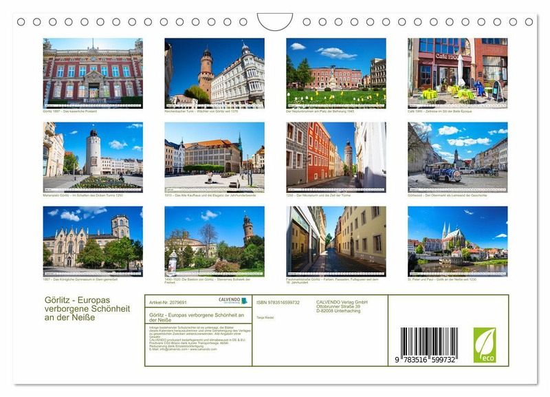 Erleben Sie eine Zeitreise durch eine der faszinierendsten Städte Europas: Görlitz - ein Meisterwerk aus Stein, Farbe und Geschichte. Dieser Kalender zeigt zwölf eindrucksvolle Orte, von mittelalterlichen Türmen bis hin zu Jugendstilfassaden - jedes Bild ein Tor in eine andere Epoche. Ob Architekturfan, Stadtliebhaber oder Entdeckerin urbaner Geheimnisse: Hier vereinen sich Ästhetik und Vergangenheit zu einem einzigartigen Jahresbegleiter. Lassen Sie sich Monat für Monat von der stillen Schönheit Görlitz' überraschen - so vielseitig, wie die Stadt selbst.