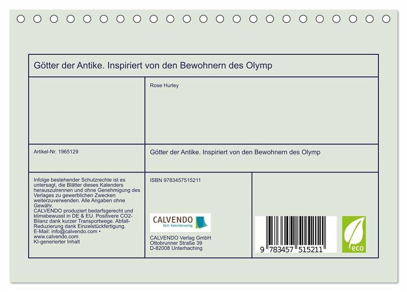 QUALITÄT - Hochwertiger Fotokalender mit 12 wunderschönen Motiven auf lichtbeständigem Bilderdruckpapier, robuste Spiralbindung.NACHHALTIG - deutliche Abfallreduzierung durch bedarfsgerechte Einzelstückfertigung, umweltfreundliches FSC-zertifiziertes Papier, Produktion in Deutschland, klimabewusste Logistik.PERFEKTES GESCHENK - Kalender für Freunde und Familie, für Kinder und Erwachsene, jung und alt, zu Weihnachten, Geburtstag oder zwischendurch.VIELFALT - Bildkalender in verschiedenen Formaten, z.B. DIN A5, DIN A4, DIN A3 sowie DIN A2. Ob Naturmotiv, Gemälde oder Fotos, ideal für ein persönliches Wohlfühlambiente.Mächtigen Wesen der antiken Mythologie in schönen Bildern von Autor(in): Rose Hurley