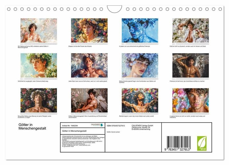 Dieser Kalender fängt die Essenz göttlicher Schönheit und beeindruckender Männlichkeit ein, präsentiert durch atemberaubende Fotografien. Jede Seite zeigt einen modernen Adonis, der durch seine ästhetische Perfektion, seine stilvolle Eleganz und seine innere Stärke besticht. Lassen Sie sich Monat für Monat von diesen herausragenden Persönlichkeiten inspirieren und tauchen Sie ein in eine Welt voller Anmut und Charisma. Alle hier gezeigten Bilder wurden mit Sorgfalt, Liebe und mit Hilfe einer KI generiert. Abschließend werden sie mit Bildbearbeitungsprogrammen überarbeitet und in den Kalender eingefügt.