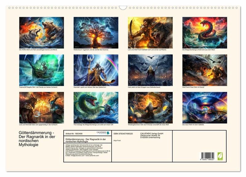 Erleben Sie das faszinierende Ende der nordischen Mythologie mit unserem Kalender "Götterdämmerung - Der Ragnarök". In zwölf atemberaubenden KI-generierten Gemälden entfaltet sich das mythische Geschehen des Ragnarök, des epochalen Weltuntergangs und der Wiedergeburt. Tauchen Sie ein in eine reiche Welt von Überlieferungen, in der die Götter gegen die Kräfte des Chaos kämpfen. Jeder Monat enthüllt ein farbgewaltiges Spektakel, das die Dramatik dieser Legenden einfängt und eine visuelle Reise durch die nordische Mythologie ermöglicht. Ein unverzichtbarer Begleiter für Geschichts- und…mehr