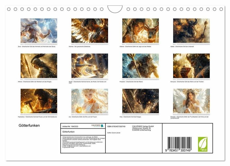 Erlebe die faszinierenden Mythen des Olymps - voller Macht, Liebe, Intrigen und epischer Schlachten. Begleite Zeus, den Herrscher des Himmels, Poseidon, den wilden Meeresgott, und die wunderschöne Aphrodite, Göttin der Liebe. Erfahre, wie Hades über die Unterwelt wacht und Athene mit Weisheit und Mut glänzt. Von strahlenden Helden bis zu rachsüchtigen Titanen - die Geschichten der griechischen Götter sind zeitlos und voller Magie. Lass dich verzaubern und entdecke eine Welt, in der Götter das Schicksal der Menschen lenken und Mythen lebendig werden! Alle hier gezeigten Bilder wurden mit Sorgfalt, Liebe und mit Hilfe einer KI generiert. Abschließend werden sie mit Bildbearbeitungsprogrammen überarbeitet und in den Kalender eingefügt.
