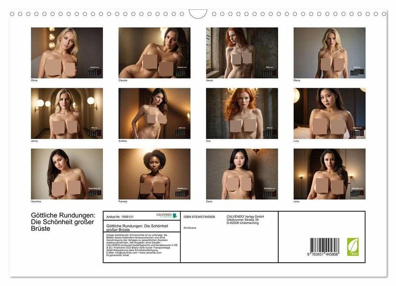 KI generierte Bilder. Eintauchen in eine Welt üppiger Schönheit! Unser neuer Kalender präsentiert stolz die majestätische Pracht großer Brüste. Jedes Bild fängt die sinnliche Ausstrahlung und die einzigartige Anmut dieser femininen Merkmale ein. Von kunstvollen Posen bis hin zu natürlicher Schönheit bietet dieser Kalender eine Ode an die Vielfalt weiblicher Formen. Erleben Sie die kraftvolle Ästhetik, die von jeder Seite dieses Kalenders strahlt, und lassen Sie sich von der zeitlosen Schönheit der weiblichen Kurven verzaubern. Perfekt als Geschenk für Liebhaberinnen der weiblichen Schönheit oder als dekoratives Element für jeden Raum, der einen Hauch von Eleganz und Sinnlichkeit verdient. Sichern Sie sich Ihr Exemplar und bringen Sie die Pracht großer Brüste zu ihnen.