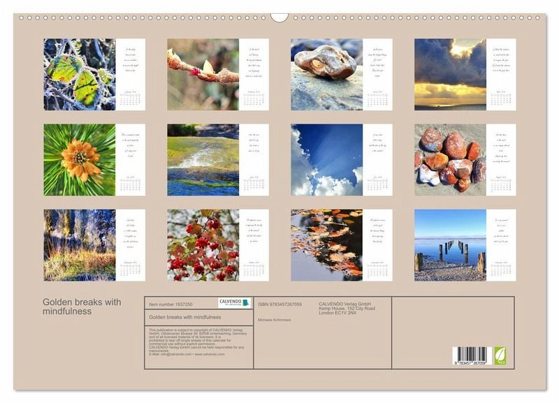 QUALITY - High-quality photo calendar with 12 beautiful images on light-resistant paper, robust spiral binding with hanger.SUSTAINABLE - Significant waste reduction due to print-on-demand production, environmentally friendly FSC-certified paper, produced in the UK, climate-conscious logistical processes.PERFECT GIFT - calendars for friends and family, for children, all ages and all occasions, from Christmas to birthdays and everything in between.LOTS OF CHOICE - Wall calendars in different sizes (DIN A4 and DIN A3), for any topic and personal taste, featuring photography, painting and illustrations.Mindful moments in the great outdoors., author: Michaela Spreider
