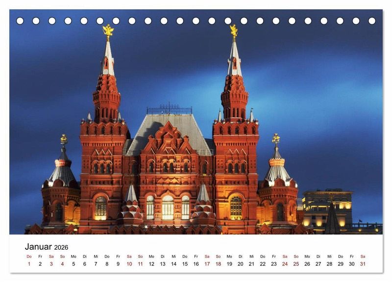 Das größte Land der Erde ist natürlich auch das schönste. Außer Wunder der Natur gibt es in Russland auch zahlreiche architektonische Meisterwerke. Diese Ausgabe bietet Ihnen die Möglichkeit, das ganze Jahr die bekanntesten Motive aus Russland zu genießen. Moskau, Sankt-Petersburg, alte russische Städte und Kirchen - alles in diesem Kalender.