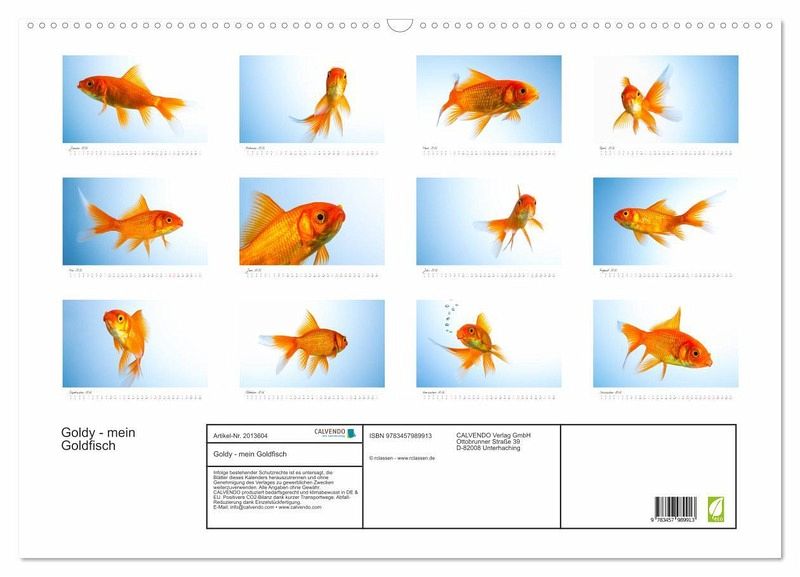 Wer kennt ihn nicht "Goldy" der geliebte Goldfisch. Er ist aus Gold und schmollt und schwimmt im Goldfischglas immerzu im Kreis. Manchmal beruhigt er dich oder bringt dich zum Lachen. Mit ihm zusammen kannst du ein ganzes Jahr lang Freude haben, egal ob Baby, Kind oder erwachsener. Er wird dich begleiten beim Einschlafen, dir Zuneigung geben und dich Trösten wenn es dir schlecht geht. Goldy das wohl älteste Haustier der Welt wird auch dich Monat für Monat in seinen Bann ziehen.