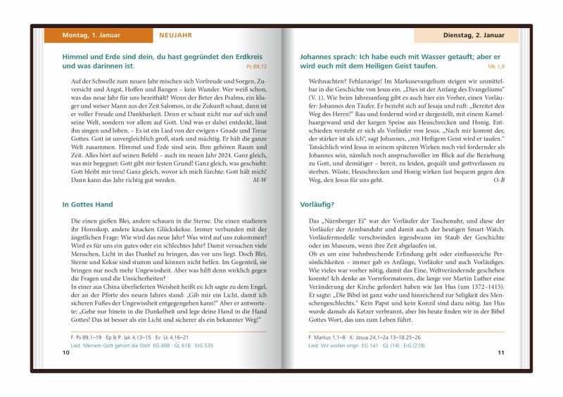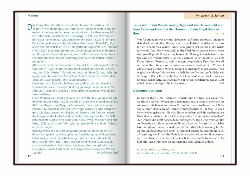 Besondere Geschichten und Ereignisse, Verblüffendes und Vertrautes begleiten die tägliche Begegnung mit Gott - für viele Bibelleserinnen und -leser ein unverzichtbarer Impuls für den Tag! Über 200 Mitarbeitende aus fünf Ländern und verschiedenen christlichen Kirchen erschließen Tag für Tag die Reichtümer der biblischen Texte und sorgen dafür, dass der Neukirchener Kalender auch weiterhin für einen offenen und lebensbejahenden Glauben steht. Gottes Wort für jeden Tag ist das Andachtsbuch mit besonders viel Tiefe. Neben den Texten des Neukirchener Kalenders enthält es noch weitere Inhalte, die den besonderen Mehrwert ausmachen: Die lebendigen Text-Bild-Meditationen holen die Monatssprüche ausdrucksstark ins Heute. Kurze Vorstellungen der biblischen Bücher aus dem Bibelleseplan durch ausgesuchte Theologen runden die Ausgabe ab. Mit seinem festen Einband, dem Lesebändchen und der farbigen Gestaltung ist diese besondere Version des Neukirchener Kalenders auch ideal als Geschenk geeignet.Der Neukirchener Kalender folgt dem Standard-Bibelleseplan der Ökumenischen Arbeitsgemeinschaft für Bibellesen.