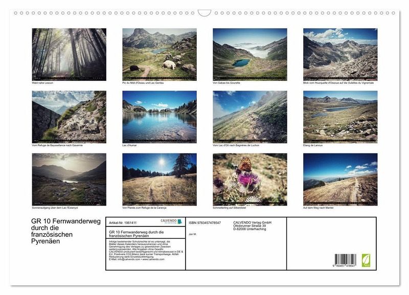 Der GR 10 zählt zu den bekanntesten uns schönsten Fernwanderwegen Europas. Über fast 1.000 Kilometer Länge und mehr als 40.000 Höhenmeter führt der Weg durch die französischen Pyrenäen von Hendaye an der Atlantikküste bis nach Banyuls sur Mer am Mittelmeer. Im Sommer 2023 durchwanderte der Berliner Werbefotograf Jan M. den GR 10 und hielt dabei die schönsten Momente und Panoramen fotografisch fest. Von den nebligen und grünen Wäldern des französischen Baskenlandes über die Gipfel der Hautes Pyrénées bis zu den katalanischen Pyrenäen nimmt uns der dabei entstandene Fotokalender mit auf eine atemberaubende Wanderung. Ein Kalender für Naturbegeisterte, Bergfreunde und Wanderer. Und für alle die den GR 10 noch vor, oder schon hinter sich haben.