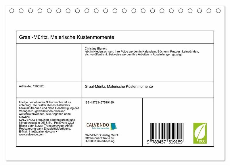 QUALITÄT - Hochwertiger Fotokalender mit 12 wunderschönen Motiven auf lichtbeständigem Bilderdruckpapier, robuste Spiralbindung.NACHHALTIG - deutliche Abfallreduzierung durch bedarfsgerechte Einzelstückfertigung, umweltfreundliches FSC-zertifiziertes Papier, Produktion in Deutschland, klimabewusste Logistik.PERFEKTES GESCHENK - Kalender für Freunde und Familie, für Kinder und Erwachsene, jung und alt, zu Weihnachten, Geburtstag oder zwischendurch.VIELFALT - Bildkalender in verschiedenen Formaten, z.B. DIN A5, DIN A4, DIN A3 sowie DIN A2. Ob Naturmotiv, Gemälde oder Fotos, ideal für ein persönliches Wohlfühlambiente.Malerische Ostsee-Momente in Graal-Müritz von Autor(in): Christine Bienert