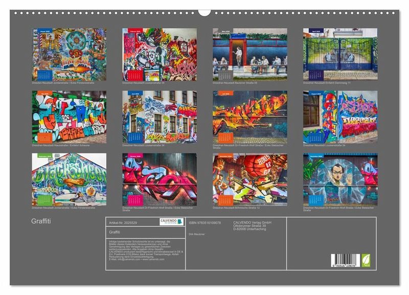 QUALITÄT - Hochwertiger Fotokalender mit 12 wunderschönen Motiven auf lichtbeständigem Bilderdruckpapier, robuste Spiralbindung mit Aufhängebügel.NACHHALTIG - deutliche Abfallreduzierung durch bedarfsgerechte Einzelstückfertigung, umweltfreundliches FSC-zertifiziertes Papier, Produktion in Deutschland, klimabewusste Logistik.PERFEKTES GESCHENK - Kalender für Freunde und Familie, für Kinderund Erwachsene, jung und alt, zu Weihnachten, Geburtstag oder zwischendurch.VIELFALT - Bildkalender in verschiedenen Formaten, z.B. DIN A5, DIN A4, DIN A3 sowie DIN A2. Ob Naturmotiv, Gemälde oder Fotos, ideal für ein persönliches Wohlfühlambiente.Schillernde bunte Farben und originelle Bilder zeichnen die Graffiti-Kunstszene aus, sehen sie die schönsten aus der Dresdner-Neustadt. von Autor(in): Dirk Meutzner