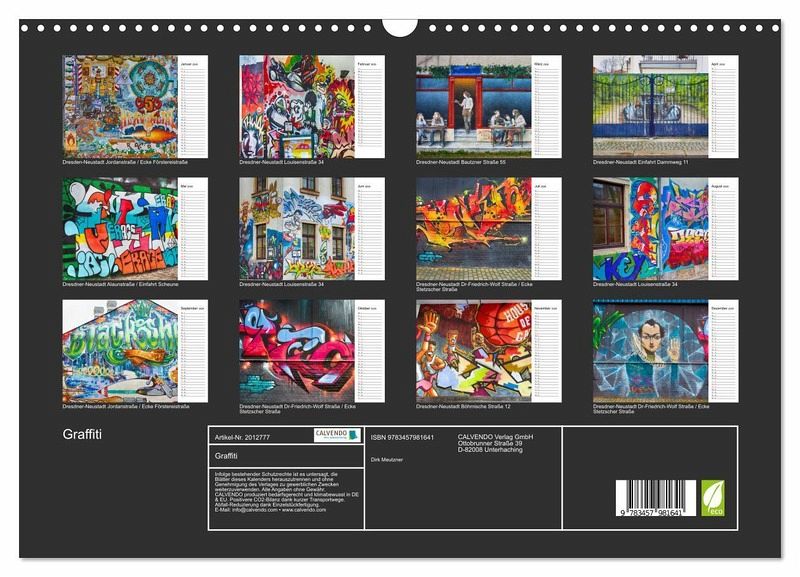 QUALITÄT - Hochwertiger Fotokalender mit 12 wunderschönen Motiven auf lichtbeständigem Bilderdruckpapier, robuste Spiralbindung mit Aufhängebügel.NACHHALTIG - deutliche Abfallreduzierung durch bedarfsgerechte Einzelstückfertigung, umweltfreundliches FSC-zertifiziertes Papier, Produktion in Deutschland, klimabewusste Logistik.PERFEKTES GESCHENK - Kalender für Freunde und Familie, für Kinderund Erwachsene, jung und alt, zu Weihnachten, Geburtstag oder zwischendurch.VIELFALT - Bildkalender in verschiedenen Formaten, z.B. DIN A5, DIN A4, DIN A3 sowie DIN A2. Ob Naturmotiv, Gemälde oder Fotos, ideal für ein persönliches Wohlfühlambiente.Schillernde bunte Farben und originelle Bilder zeichnen die Graffiti-Kunstszene aus, sehen sie die schönsten aus der Dresdner-Neustadt. von Autor(in): Dirk Meutzner