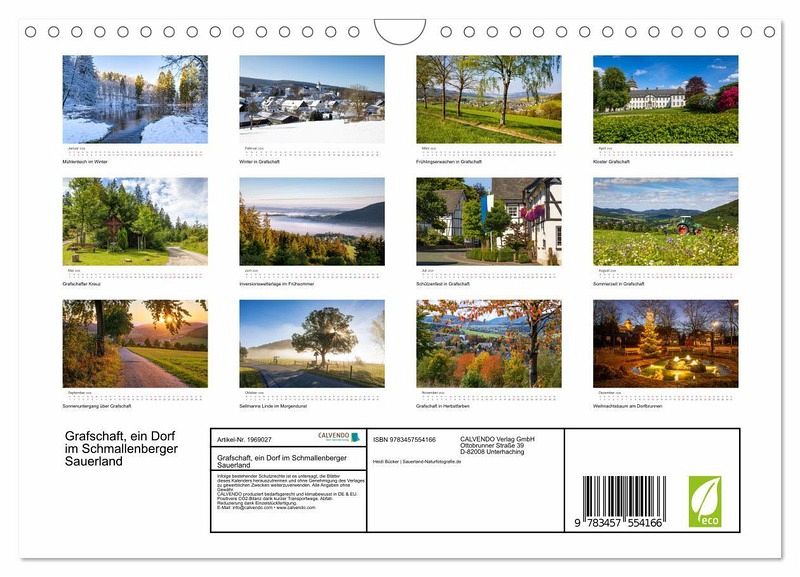QUALITÄT - Hochwertiger Fotokalender mit 12 wunderschönen Motiven auf lichtbeständigem Bilderdruckpapier, robuste Spiralbindung mit Aufhängebügel.NACHHALTIG - deutliche Abfallreduzierung durch bedarfsgerechte Einzelstückfertigung, umweltfreundliches FSC-zertifiziertes Papier, Produktion in Deutschland, klimabewusste Logistik.PERFEKTES GESCHENK - Kalender für Freunde und Familie, für Kinder und Erwachsene, jung und alt, zu Weihnachten, Geburtstag oder zwischendurch.VIELFALT - Bildkalender in verschiedenen Formaten, z.B. DIN A5, DIN A4, DIN A3 sowie DIN A2. Ob Naturmotiv, Gemälde oder Fotos, ideal für ein persönliches Wohlfühlambiente.Das Bundesgolddorf Grafschaft liegt im Schmallenberger Sauerland von Autor(in): Heidi Bücker