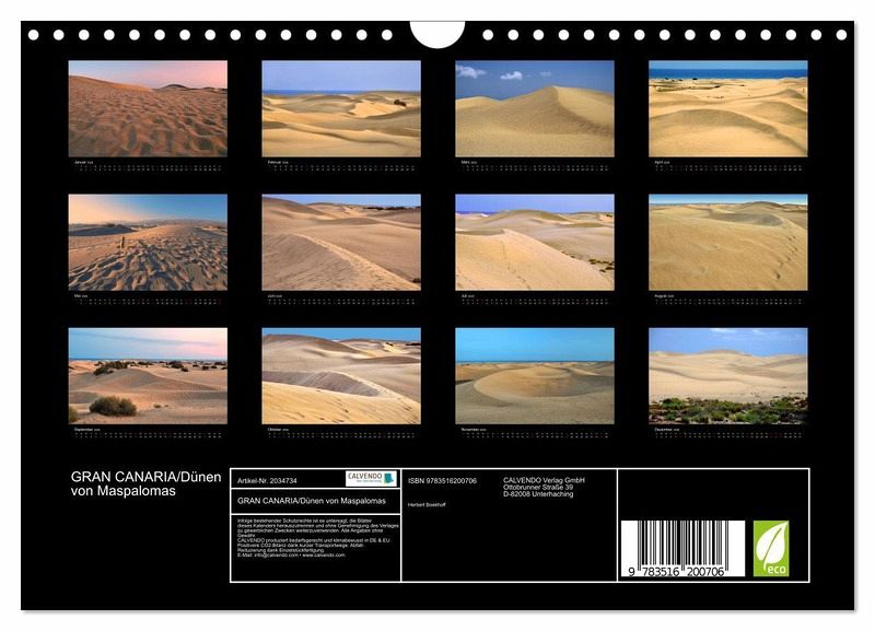 QUALITÄT - Hochwertiger Fotokalender mit 12 wunderschönen Motiven auf lichtbeständigem Bilderdruckpapier, robuste Spiralbindung mit Aufhängebügel.NACHHALTIG - deutliche Abfallreduzierung durch bedarfsgerechte Einzelstückfertigung, umweltfreundliches FSC-zertifiziertes Papier, Produktion in Deutschland, klimabewusste Logistik.PERFEKTES GESCHENK - Kalender für Freunde und Familie, für Kinder und Erwachsene, jung und alt, zu Weihnachten, Geburtstag oder zwischendurch.VIELFALT - Bildkalender in verschiedenen Formaten, z.B. DIN A5, DIN A4, DIN A3 sowie DIN A2. Ob Naturmotiv, Gemälde oder Fotos, ideal für ein persönliches Wohlfühlambiente.Fotos der Dünen von Maspalomas von Autor(in): Herbert Boekhoff