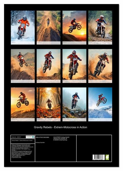 Dieser actiongeladene Kalender zeigt spektakuläre Szenen aus der Welt des Extrem-Motocross. Mit atemberaubenden Stunts, waghalsigen Sprüngen und wilden Perspektiven. Jeder Monat bringt pure Energie und Adrenalin an deine Wand. Die Bilder wurden KI-generiert und speziell für diesen Kalender entwickelt, kraftvoll, kreativ und garantiert staubfrei im Wohnzimmer.