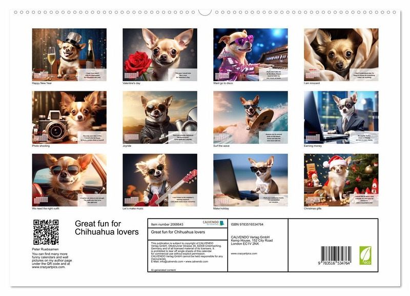 PREMIUM COLLECTION - Brilliant photo calendar with 12 beautiful motifs, high-gloss art print in museum quality.QUALITY - high-quality materials, sturdy back cover with 2 innovative insert pockets for optimum presentation on the wall.SUSTAINABLE - significant reduction in waste thanks to customised one-off production, environmentally friendly FSC-certified paper, production in Germany, climate-conscious logistics.PERFECT GIFT - calendars for friends and family, for children and adults, young and old, for Christmas, birthdays or in between.The fun annual companion for Chihuahua fans von Autor(in): Peter Rübsamen