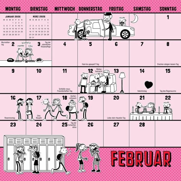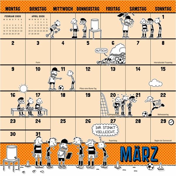 Wer am Faulzpelztag mal so richtig abhängen möchte, am Lies-ein-Buch-Tag im neuesten Greg schmökern will oder einfach mal Lust hat, den Tag des Toilettenpapiers zu feiern, der weiß mit diesem Wandkalender immer bestens Bescheid. Denn hier sind nicht nur die wichtigsten Feier- und Spaßtage des Jahres festgehalten, sondern es gibt auch genug Platz zum Eintragen von Geburtstagen oder anderen Terminen, die auf keinen Fall vergessen werden dürfen.
