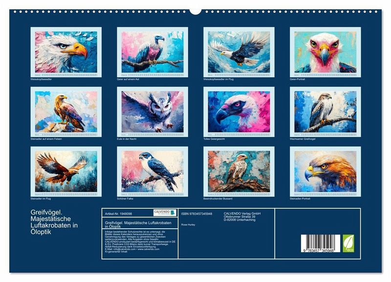 Dieser schöne Kalender fängt die Schönheit und Mystik von Greifvögeln ein. Jede Seite zeigt ein mit Hilfe von KI generiertes Ölgemälde, das Vögel in verschiedenen Szenen festhält - im Flug, auf Ästen oder als Portrait. Die Verbindung von Technologie und klassischer Kunst lässt die Bilder lebendig wirken, als wären sie von Hand gemalt. Dieser Kalender ist eine Hommage an die faszinierende Welt der Raubvögel und die künstlerischen Möglichkeiten der KI.