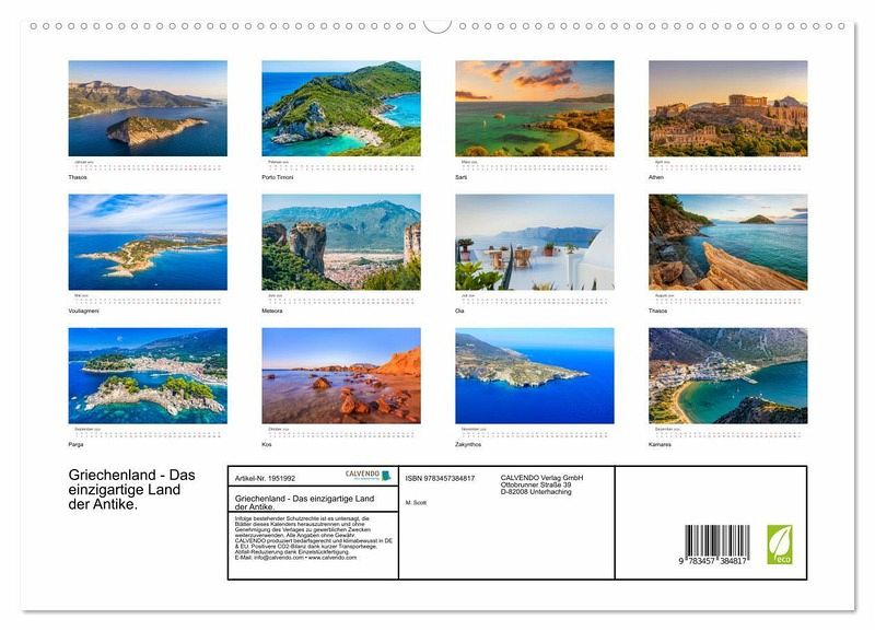 Erleben Sie das sonnige Griechenland jeden Monat aufs Neue mit unserem atemberaubenden Kalender! Jede Seite bietet Ihnen ein spektakuläres Foto von den unvergesslichen Landschaften, historischen Sehenswürdigkeiten und dem kristallklaren Meer. Lassen Sie sich inspirieren von den atemberaubenden Sonnenuntergängen, den ruhigen Stränden und den atmosphärischen Städten.