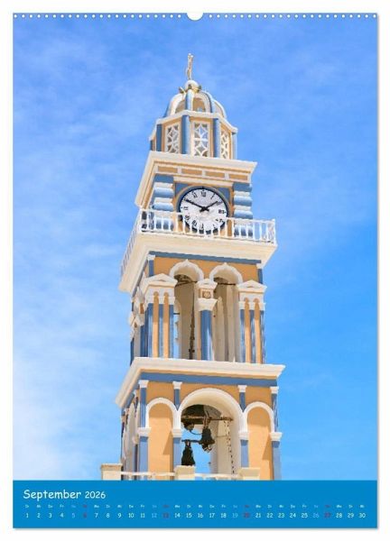 September: Glockenturm der Kathedrale in Fira