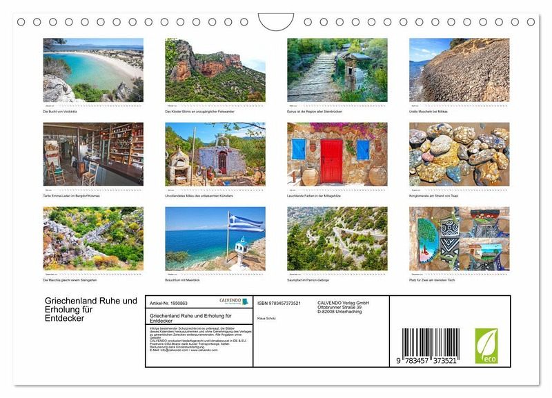 QUALITÄT - Hochwertiger Fotokalender mit 12 wunderschönen Motiven auf lichtbeständigem Bilderdruckpapier, robuste Spiralbindung mit Aufhängebügel.NACHHALTIG - deutliche Abfallreduzierung durch bedarfsgerechte Einzelstückfertigung, umweltfreundliches FSC-zertifiziertes Papier, Produktion in Deutschland, klimabewusste Logistik.PERFEKTES GESCHENK - Kalender für Freunde und Familie, für Kinder und Erwachsene, jung und alt, zu Weihnachten, Geburtstag oder zwischendurch.VIELFALT - Bildkalender in verschiedenen Formaten, z.B. DIN A5, DIN A4, DIN A3 sowie DIN A2. Ob Naturmotiv, Gemälde oder Fotos, ideal für ein persönliches Wohlfühlambiente.Griechenland - Ruhe und Erholung für Entdecker von Autor(in): Klaus Scholz