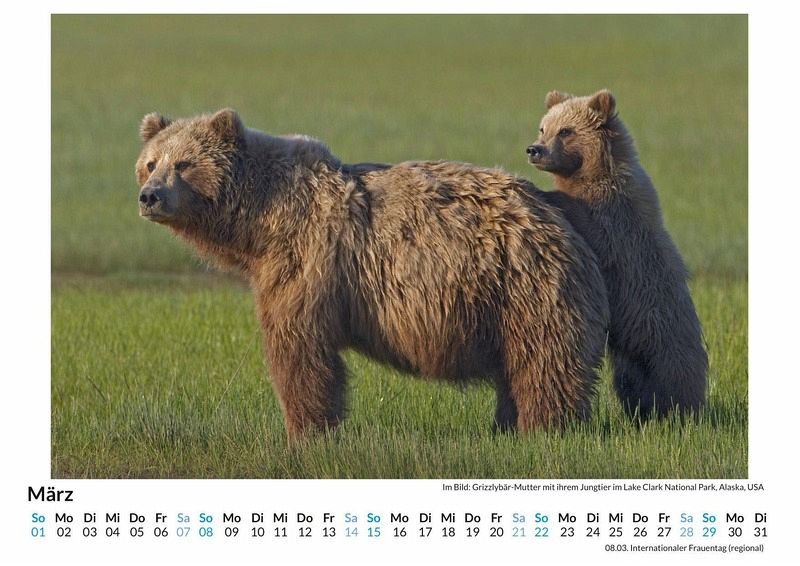 Entdecken Sie die majestätische Kraft und Schönheit des Grizzlybären in unserem exklusiven Wandkalender! Mit 12 atemberaubenden Motiven, die die Wildheit und Anmut dieser beeindruckenden Tiere einfangen, wird jeder Monat zu einem visuellen Highlight. Gedruckt auf hochwertigem, lichtbeständigem Bilderdruckpapier, bleibt die Brillanz der Bilder das ganze Jahr über erhalten. Nachhaltigkeit liegt uns am Herzen: Unsere Kalender werden in Deutschland auf FSC-zertifiziertem Papier produziert. Holen Sie sich ein Stück unberührte Natur in Ihr Zuhause und lassen Sie sich jeden Tag von der Faszination des Grizzlybären inspirieren. Perfekt als Geschenk oder für Ihre eigenen vier Wände! Hochwertig Erleben Sie ein Jahr voller Eleganz mit unserem Premium-Fotokalender. Jedes der 12 Motive ist auf hochwertigem, lichtbeständigem Bilderdruckpapier gedruckt, um die Lebendigkeit jedes Bildes zu bewahren. Die robuste Spiralbindung gewährleistet Langlebigkeit und einfache Handhabung. Nachhaltig Unser Engagement für die Umwelt spiegelt sich in jedem Exemplar wider. Durch die Produktion auf Abruf reduzieren wir signifikant unseren Abfall. Wir verwenden ausschließlich umweltfreundliches, FSC-zertifiziertes Papier. Stolz gefertigt in Deutschland, achten wir bei unserer Logistik auf Klimaschutz, um unseren ökologischen Fußabdruck zu minimieren. Das ideale Geschenk Dieser Kalender ist das perfekte Präsent für jeden Anlass - ob Weihnachten, Geburtstage oder einfach als liebevolle Aufmerksamkeit zwischendurch. Geeignet für Freunde, Familie, Kinder und Erwachsene gleichermaßen, bereichert er jedes Zuhause mit seiner Vielfalt und Schönheit, unabhängig vom Alter der Beschenkten.