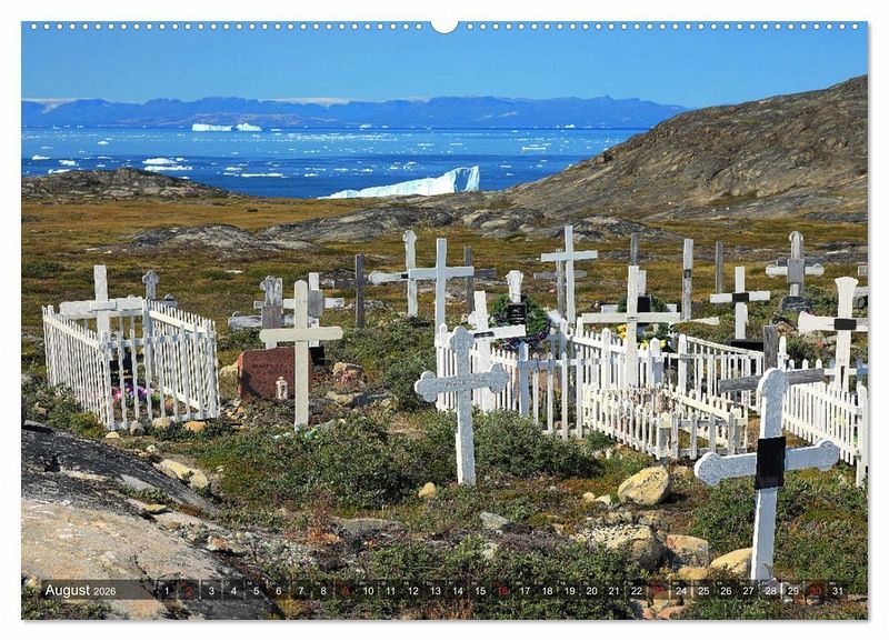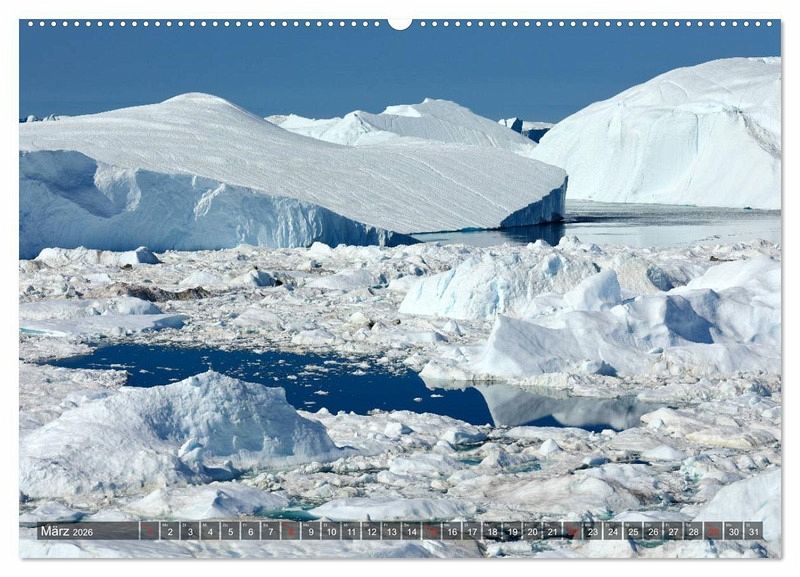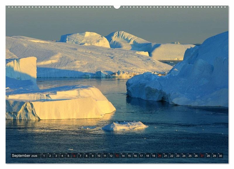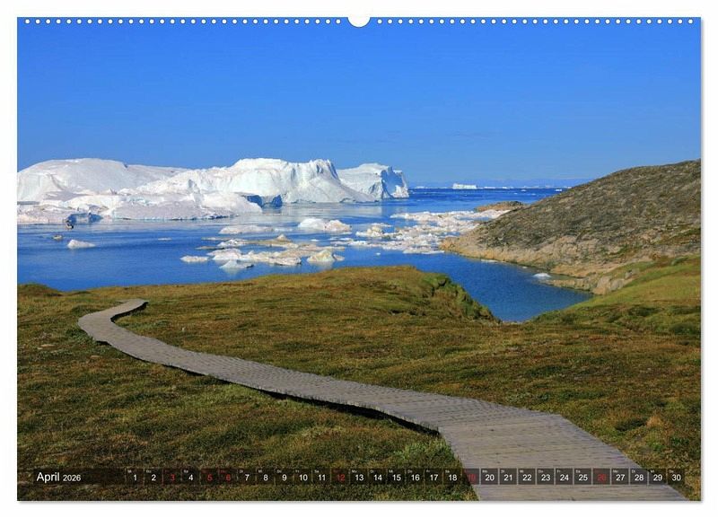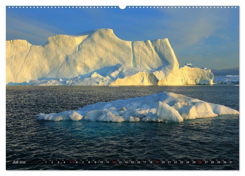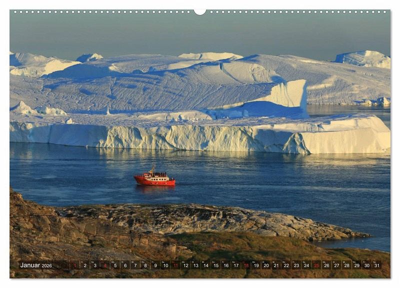 An der grönländischen Westküste liegt der nach der benachbarten Stadt Ilulissat benannte Eisfjord in der Diskobucht. Der Fjord ist im Sommer voll mit Eis und riesigen Eisbergen, deren Ursprung der Gletscher Sermeq Kujalleq ist. Wanderwege entlang des Eisfjords bieten grandiose Ausblicke, aber den besten Eindruck der Eiswelten bekommt man doch auf einer Bootsfahrt. Riesige Eisberge, farbenfrohe Häuser, Wale und magisches Licht - das Alles zeigt der Kalender.