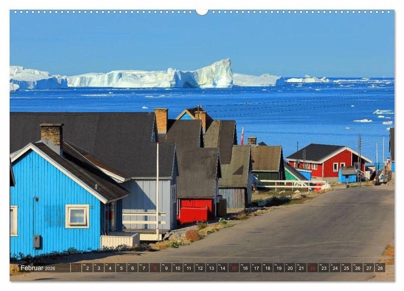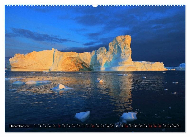 An der grönländischen Westküste liegt der nach der benachbarten Stadt Ilulissat benannte Eisfjord in der Diskobucht. Der Fjord ist im Sommer voll mit Eis und riesigen Eisbergen, deren Ursprung der Gletscher Sermeq Kujalleq ist. Wanderwege entlang des Eisfjords bieten grandiose Ausblicke, aber den besten Eindruck der Eiswelten bekommt man doch auf einer Bootsfahrt. Riesige Eisberge, farbenfrohe Häuser, Wale und magisches Licht - das Alles zeigt der Kalender.