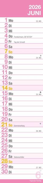 Mit seinem großzügigen Format von 15 x 64 cm bietet der Kalender viel Platz für Ihre Notizen und bleibt dennoch schlank genug, um an jeder Wand Platz zu finden. Das deutschsprachige Kalendarium informiert zuverlässig über alle Feiertage in Deutschland, Österreich und der Schweiz sowie über die Mondphasen.