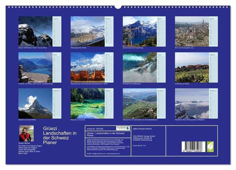 Grüezi. Genießen Sie Monat für Monat die herrlichen Landschaften in der Schweiz. Sei es im Wallis, oder im Berner Oberland, oder gar am Rheinfall. Lehnen Sie sich zurück und lassen Sie sich verzaubern. Entdecken Sie die Schweiz, die wunderschönen Landschaften hier in diesem Kalender! Planen Sie ihre Events hiermit!
