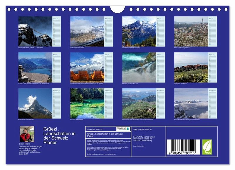 QUALITÄT - Hochwertiger Fotokalender mit 12 wunderschönen Motiven auf lichtbeständigem Bilderdruckpapier, robuste Spiralbindung mit Aufhängebügel.NACHHALTIG - deutliche Abfallreduzierung durch bedarfsgerechte Einzelstückfertigung, umweltfreundliches FSC-zertifiziertes Papier, Produktion in Deutschland, klimabewusste Logistik.PERFEKTES GESCHENK - Kalender für Freunde und Familie, für Kinder und Erwachsene, jung und alt, zu Weihnachten, Geburtstag oder zwischendurch.VIELFALT - Bildkalender in verschiedenen Formaten, z.B. DIN A5, DIN A4, DIN A3 sowie DIN A2. Ob Naturmotiv, Gemälde oder Fotos, ideal für ein persönliches Wohlfühlambiente.Die Schweiz lädt zum Verweilen ein. Lassen Sie sich überraschen. von Autor(in): Susan Michel