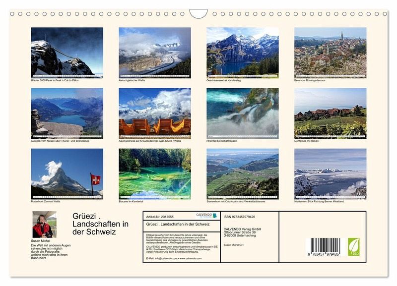 QUALITÄT - Hochwertiger Fotokalender mit 12 wunderschönen Motiven auf lichtbeständigem Bilderdruckpapier, robuste Spiralbindung mit Aufhängebügel.NACHHALTIG - deutliche Abfallreduzierung durch bedarfsgerechte Einzelstückfertigung, umweltfreundliches FSC-zertifiziertes Papier, Produktion in Deutschland, klimabewusste Logistik.PERFEKTES GESCHENK - Kalender für Freunde und Familie, für Kinder und Erwachsene, jung und alt, zu Weihnachten, Geburtstag oder zwischendurch.VIELFALT - Bildkalender in verschiedenen Formaten, z.B. DIN A5, DIN A4, DIN A3 sowie DIN A2. Ob Naturmotiv, Gemälde oder Fotos, ideal für ein persönliches Wohlfühlambiente.Die Schweiz lädt zum Verweilen ein. Lassen Sie sich überraschen. von Autor(in): Susan Michel