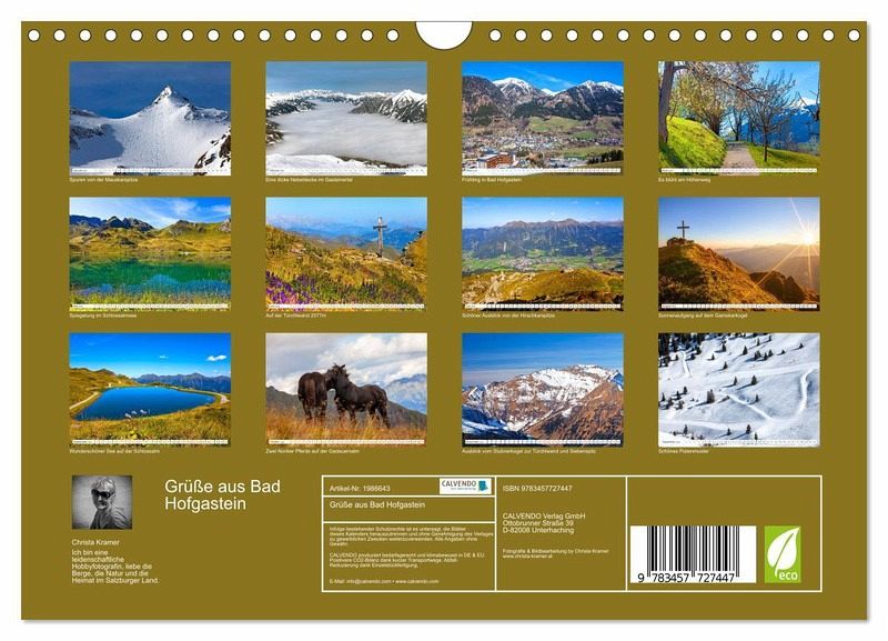 QUALITÄT - Hochwertiger Fotokalender mit 12 wunderschönen Motiven auf lichtbeständigem Bilderdruckpapier, robuste Spiralbindung mit Aufhängebügel.NACHHALTIG - deutliche Abfallreduzierung durch bedarfsgerechte Einzelstückfertigung, umweltfreundliches FSC-zertifiziertes Papier, Produktion in Deutschland, klimabewusste Logistik.PERFEKTES GESCHENK - Kalender für Freunde und Familie, für Kinder und Erwachsene, jung und alt, zu Weihnachten, Geburtstag oder zwischendurch.VIELFALT - Bildkalender in verschiedenen Formaten, z.B. DIN A5, DINA4, DIN A3 sowie DIN A2. Ob Naturmotiv, Gemälde oder Fotos, ideal für ein persönliches Wohlfühlambiente.Impressionen aus Bad Hofgastein in den vier Jahreszeiten von Autor(in): Christa Kramer
