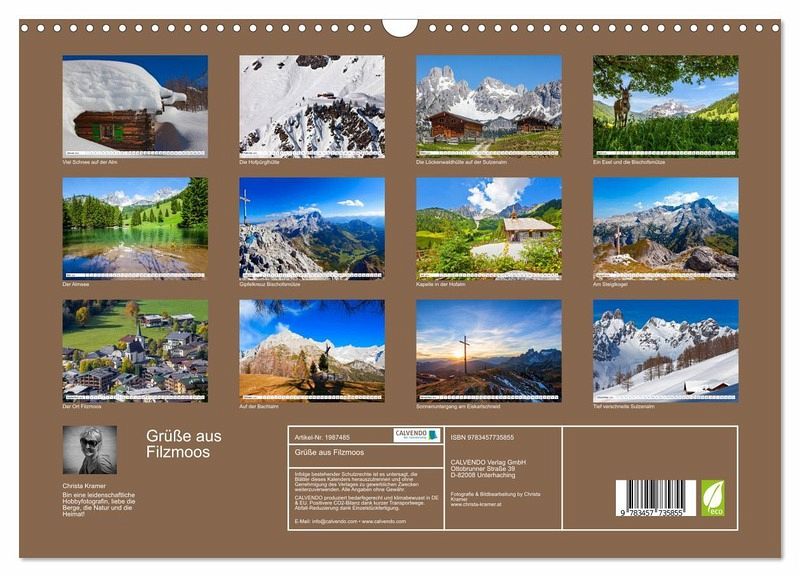 QUALITÄT - Hochwertiger Fotokalender mit 12 wunderschönen Motiven auf lichtbeständigem Bilderdruckpapier, robuste Spiralbindung mit Aufhängebügel.NACHHALTIG - deutliche Abfallreduzierung durch bedarfsgerechte Einzelstückfertigung, umweltfreundliches FSC-zertifiziertes Papier, Produktion in Deutschland, klimabewusste Logistik.PERFEKTES GESCHENK - Kalender für Freunde und Familie, für Kinder und Erwachsene, jung und alt, zu Weihnachten, Geburtstag oder zwischendurch.VIELFALT - Bildkalender in verschiedenen Formaten, z.B. DIN A5, DIN A4, DIN A3 sowie DIN A2. Ob Naturmotiv, Gemälde oder Fotos, ideal für ein persönliches Wohlfühlambiente.Impressionen aus dem schönen Filzmoos von Autor(in): Christa Kramer