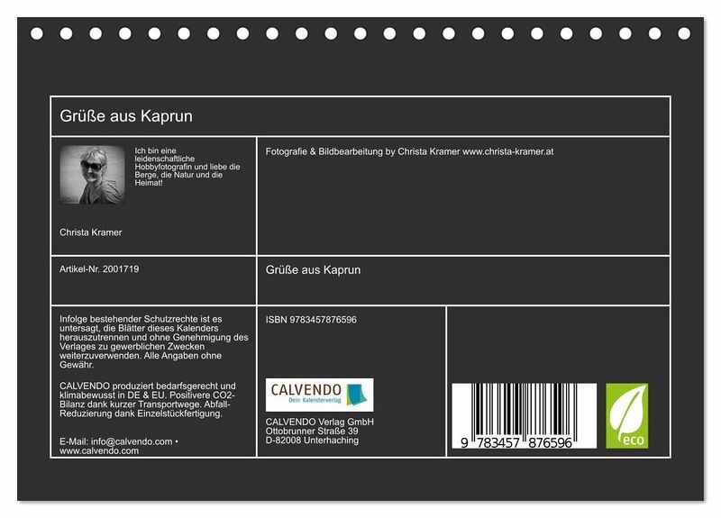 QUALITÄT - Hochwertiger Fotokalender mit 12 wunderschönen Motiven auf lichtbeständigem Bilderdruckpapier, robuste Spiralbindung.NACHHALTIG - deutliche Abfallreduzierung durch bedarfsgerechte Einzelstückfertigung, umweltfreundliches FSC-zertifiziertes Papier, Produktion in Deutschland, klimabewusste Logistik.PERFEKTES GESCHENK - Kalender für Freunde und Familie, für Kinder und Erwachsene, jung und alt, zu Weihnachten, Geburtstag oder zwischendurch.VIELFALT - Bildkalender in verschiedenen Formaten, z.B. DIN A5, DIN A4, DIN A3 sowie DIN A2. Ob Naturmotiv, Gemälde oder Fotos, ideal für ein persönliches Wohlfühlambiente.Schöne Impressionen von Kaprun und Kitzsteinhorn von Autor(in): Christa Kramer